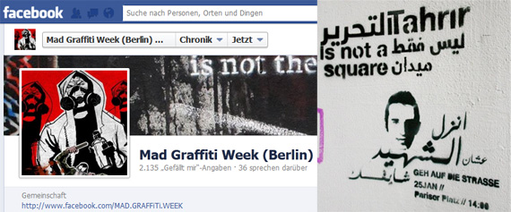 The Mad Graffiti week is a global event in support of the Egyptian Revolution. On this Facebook page you find all information about the activities in Berlin.