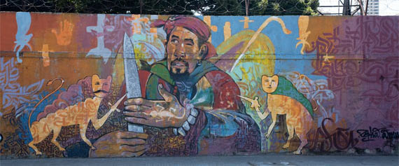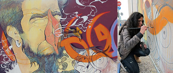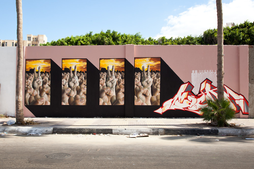 This Tribute to the Arab Revolution, by AKUT, TASSO, CASE, RUSK (Ma’Claim), depicts four panels with seemingly identical paintings: A mass of people raising their fists and one hand making the “Peace” sign. “This symbolizes victory as well as it stands for the peace and freedom, which we all hope follows afterwards.” says CASE. The secret of this mural is that it – just like the revolution – extends into the Internet and uses it to further reveal its message. Ma’Claim did not want to make a political statement for one group or notion, but rather honor the power of a movement that has inspired the world.
