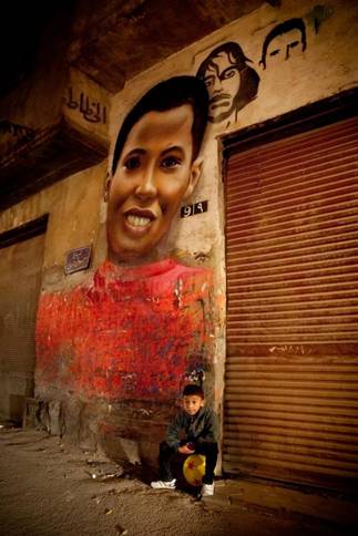The mural he finally painted, in front of the Townhouse Gallery, is a portrait of an Egyptian boy whom Case met in the street while painting in Cairo. Behind him he placed simple, black stencils of Khaled Said and Mina Daniel. The boy is alive looking forward to the possibilities of a better future for which Khaled and Daniel died.