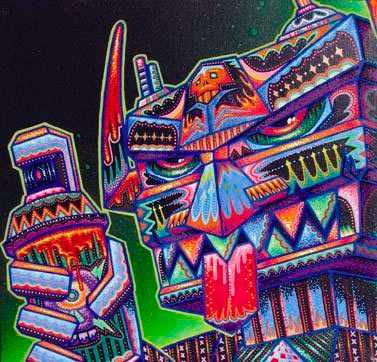 He approaches his paintings with the same zest and casual grace as he does his throw-ups, with bold dripping explosions of vibrant colors and freaky cartoons. With frequent trips to Europe his style has inspired the new wave of Scandinavian-loose-bombing-style pieces. Today, he exhibits his artwork in galleries worldwide and does collaborations with urban culture brands. Despite this Ghost remains an enigma, he isn’t social, and he does not want to be your friend. But his artwork like his bombing is something fantastic that deserves attention, for this he is overdue.