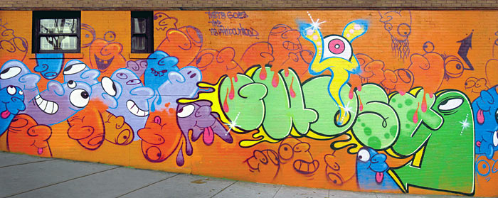 GHOST was one of the last kings of the New York City train writing era. He experimented with traditional letter styles until developing his own loose, funky and psychedelic letters that sprouted from his twisted drug-seeped brain and his passion for bombing. When most writers see a train yard as an opportunity to paint a nice colorful piece, Ghost sees the yard as a place to bomb, to do hundreds of throw-ups.
